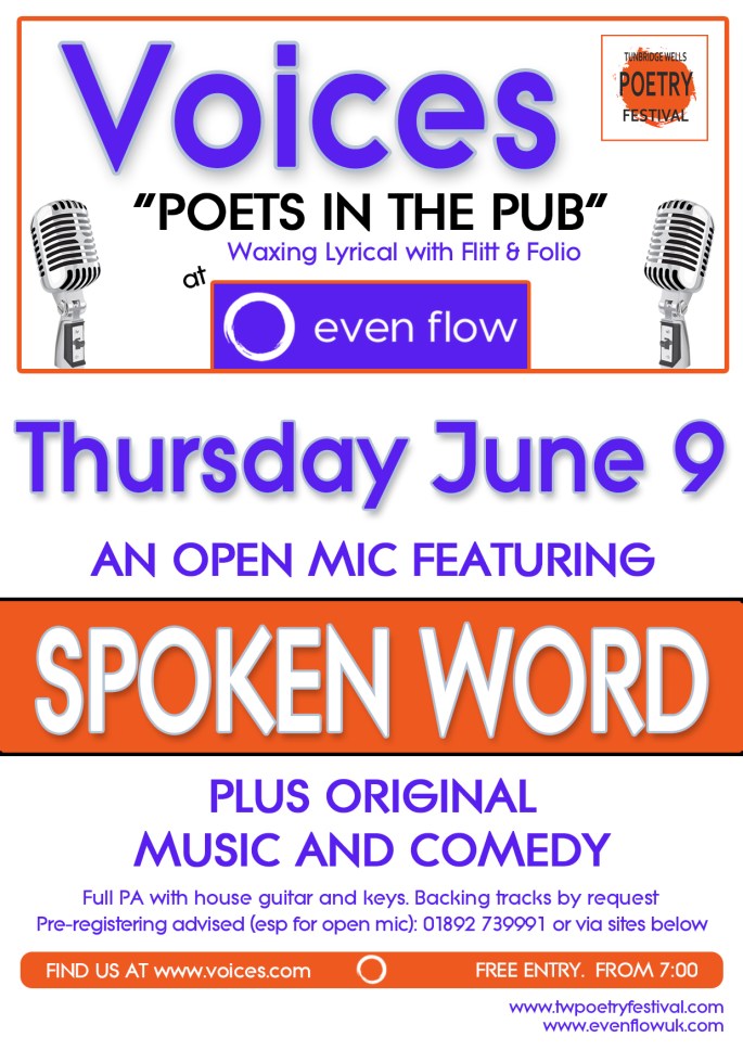 Things have been a little quiet on the Voices front as Pam and Ivor have been channelling their energies (along with the rest of the festival team) into the Tunbridge Wells Poetry Festival. But as ye sow, so shall ye reap, as the old saying goes, and we are delighted to announce that along with a whole host of other wonderful events, Voices, temporarily rebranded as Poets in the Pub, will be out in force throughout June to scatter joy, laughter and wordy goodness near and far.