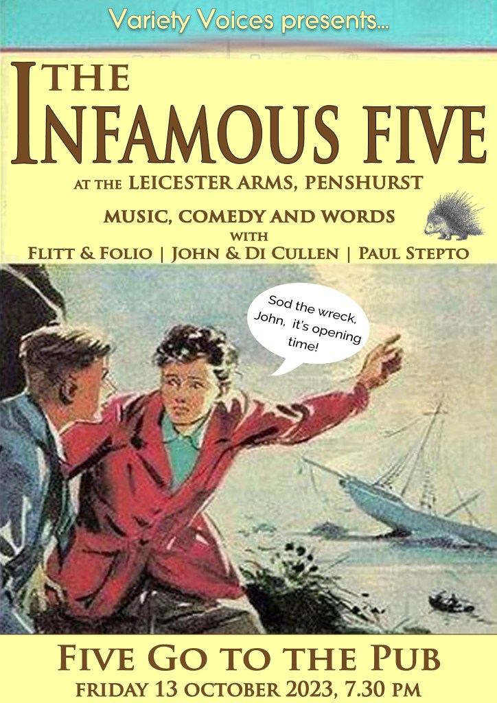 Well as you can see from the poster below, we’re back at one of our favourite Voices haunts, The Leicester Arms in Penshurst, but this time with some new friends in tow and a few tweaks to the format of our previous themed events. While words and humour will, as always, be key elements of the evening’s entertainment we’ll be taking the musical side of things slightly more seriously by asking our special guests to do the honours. Not so much a Voices evening, then, as a shared variety stage that will hopefully be the first of many similar outings for “The Infamous Five”, as we are billing ourselves until we think of something better.