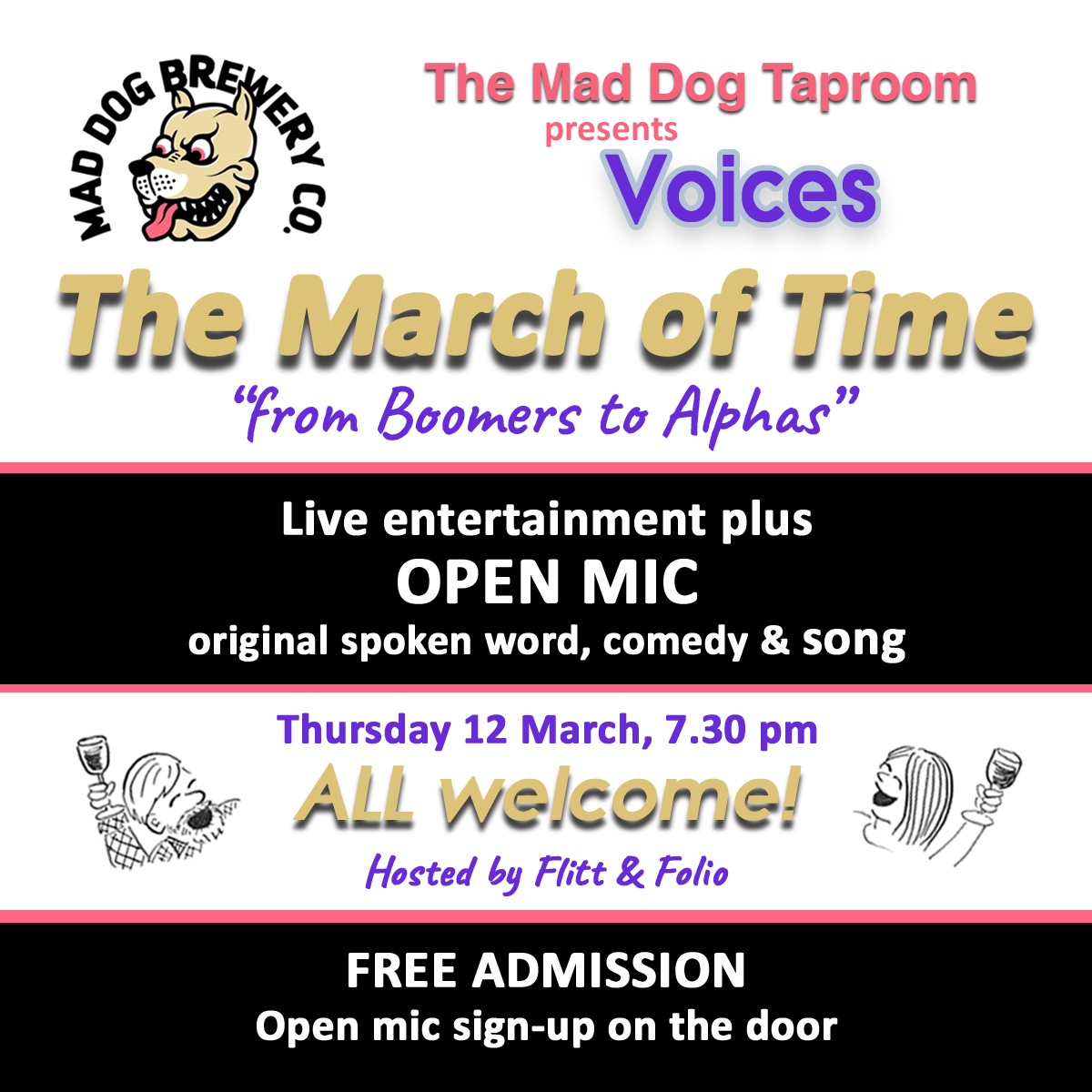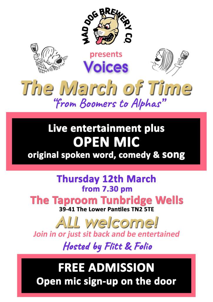 Before that, however, we have another new venue to fill with joy and laughter as we haul our PA to the Taproom Tunbridge Wells on March 12th, when we’ll be taking Time Marches On (see what we did there?) as the theme for our shenanigans. As always, we’ll be leaving that title wide open for interpretation, so whether you’re a Boomer or an Alpha (or somewhere in between) we’ll be glad to hear your take on it.